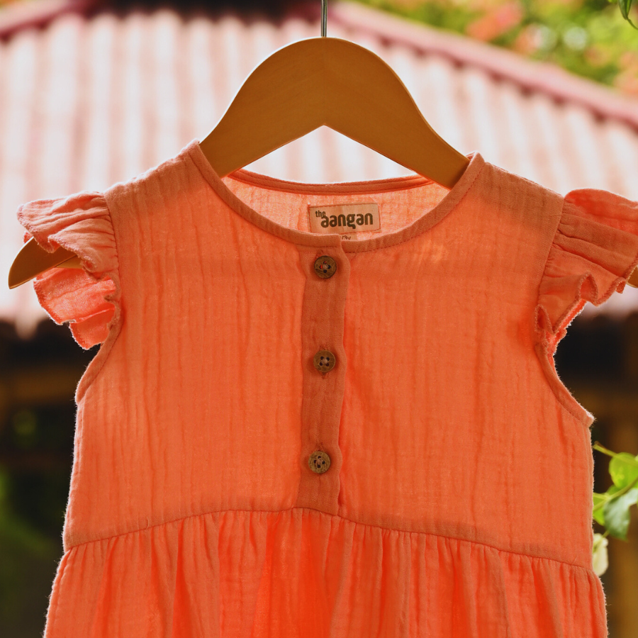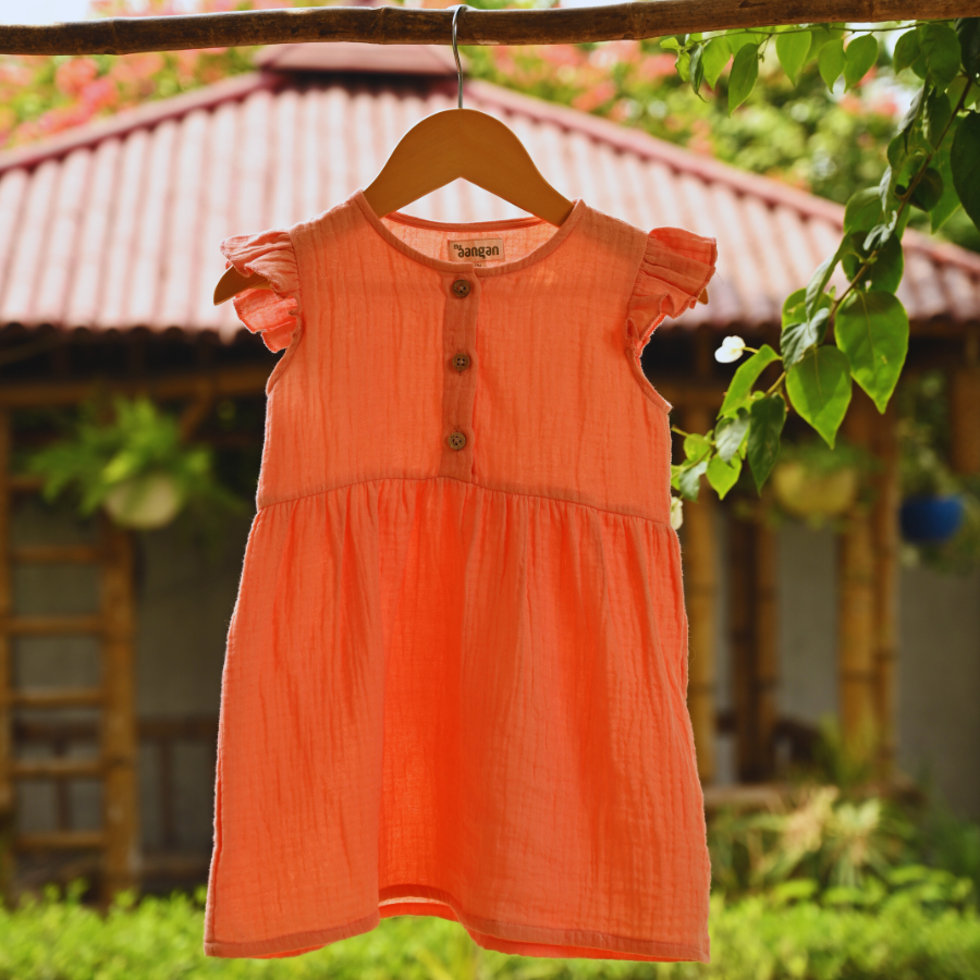 Aangan’s Aamras Frock is a tribute to the carefree play and warm summer hues of childhood. Crafted in a rich, sunset-inspired mango-orange shade, this frock is made from 100% double-gauze cotton muslin—lightweight, breathable, and incredibly soft for delicate skin. With fluttery sleeves and a relaxed fit, it’s perfect for garden strolls, first steps, or twirling under the sun.