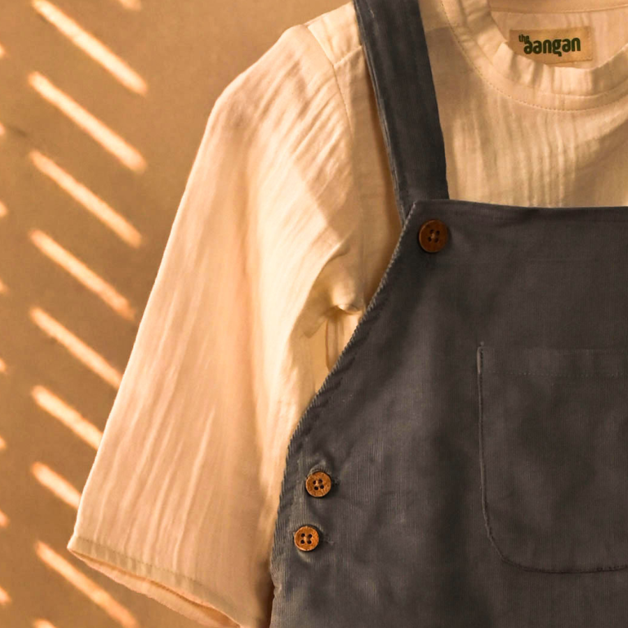 Let your baby explore the world with ease and comfort in Aangan’s Blue Corduroy Dungaree Set, part of our Saundh - Nayi Kahani collection. Crafted for little adventurers aged 0 to 24 months, this set combines lightweight corduroy dungarees with a soft, organic muslin cotton upper. The breathable fabrics keep your baby snug yet comfortable, making it perfect for mild winters or cool breezy days.