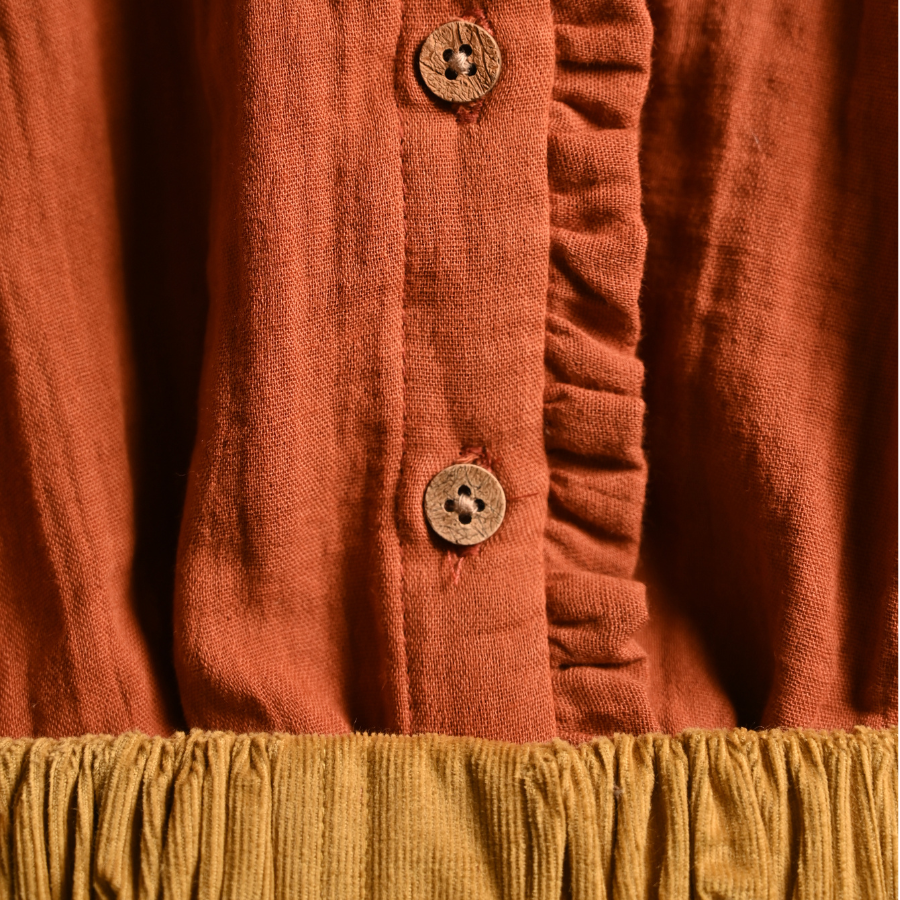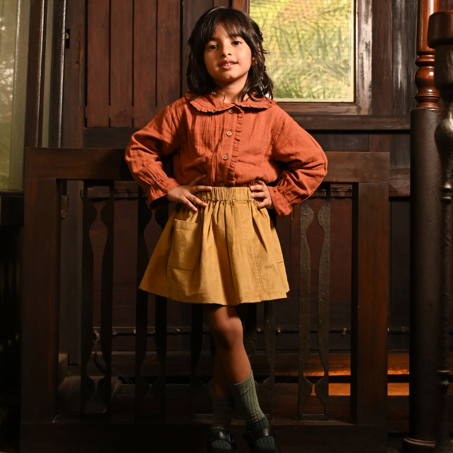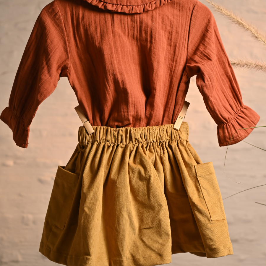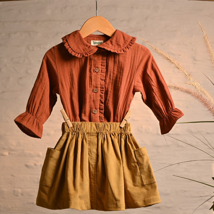 Let your little one twirl in joy with Aangan’s Brown Corduroy Skirt Set, paired with a soft maroon muslin top. Part of our Saundh - Nayi Kahani collection, this set blends the richness of lightweight corduroy with the softness of organic muslin, ensuring comfort for your child throughout the day. Perfect for mild winters, the set is designed to keep your little one cozy while allowing for easy movement.