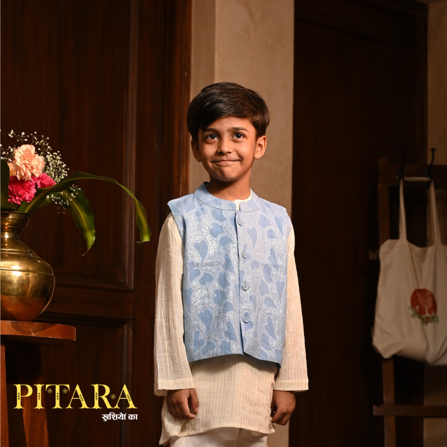 Dress your little one like a prince in our Cream Kurta Bandi Pajama Set, featuring a soft cotton kurta-pajama with a blue patterned bandi jacket. Handcrafted in 100% natural cotton, it’s gentle on delicate skin, itch-free, and baby-safe. Designed for newborns to 7-year-olds, this festive outfit is perfect for family gatherings, weddings, and festivals.