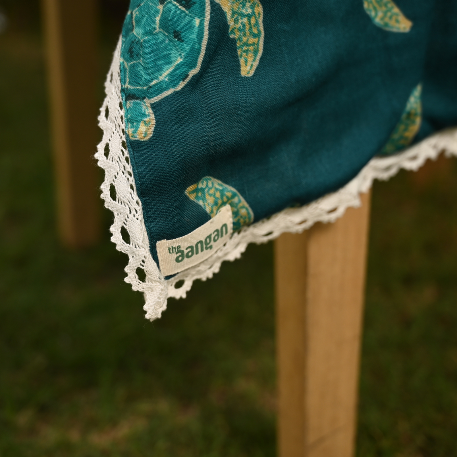 Aangan’s Green Tortoise Dohar is inspired by slow, sleepy adventures and the quiet comfort of nature. Crafted from 100% organic cotton, this lightweight dohar features a soothing tortoise print in calming green, making it a perfect everyday companion for your little explorer.