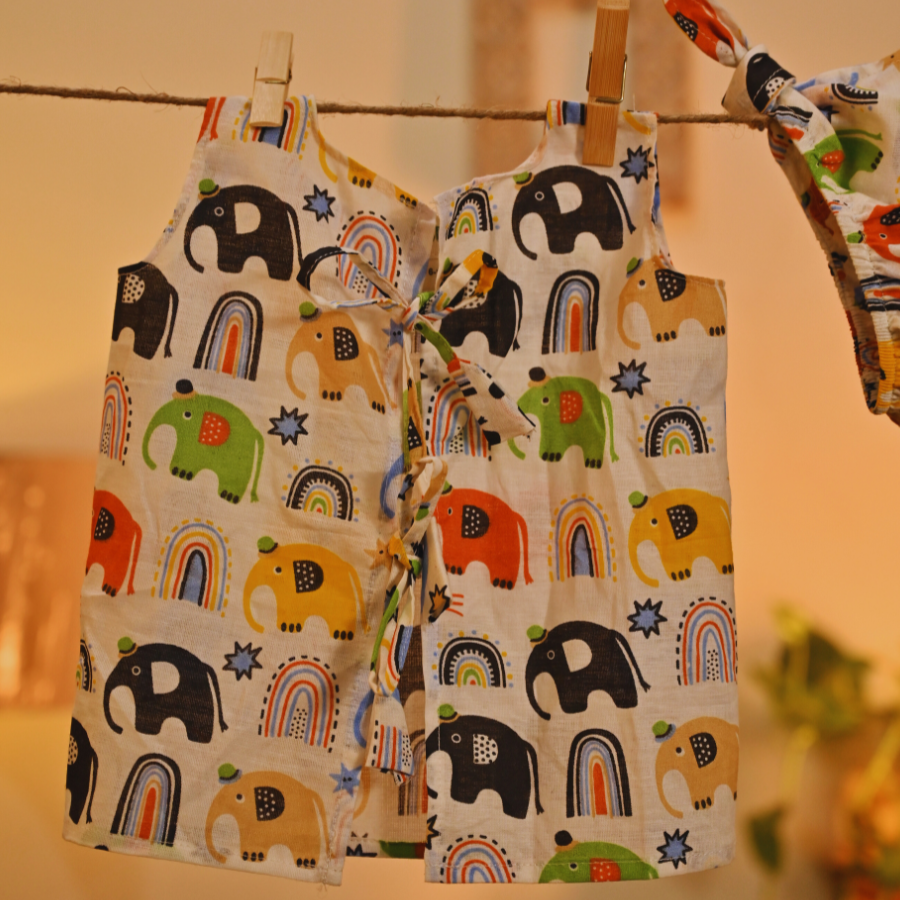 Crafted in light, breezy cotton, this 2-piece set includes a wrap-style jhabla top and a comfortable langot, making dressing easy and fuss-free for new parents.