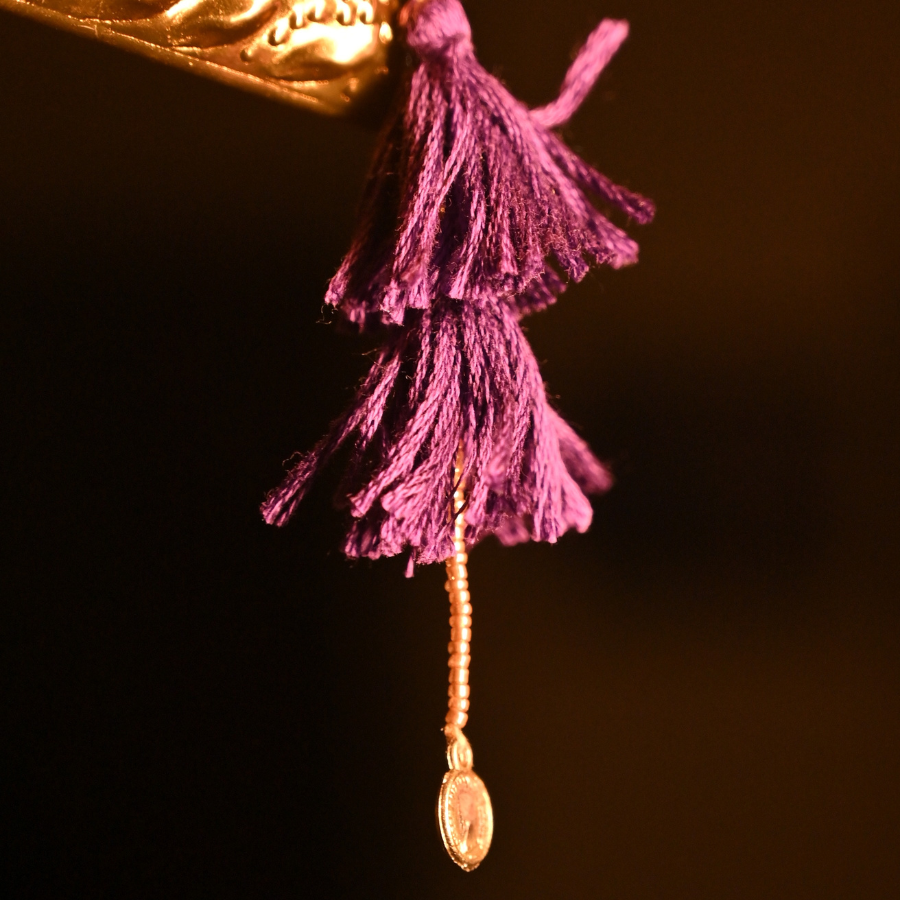 A keepsake straight from dadi’s festive pitara, the Sunehri Pitara Ginni Bag is handcrafted in alloy, carrying intricate floral carvings that evoke timeless tradition. Finished with a soft Purple tassel, it adds a playful charm to your festive look. Perfect for gifting coins, jewelry, or as a statement accessory this Diwali.