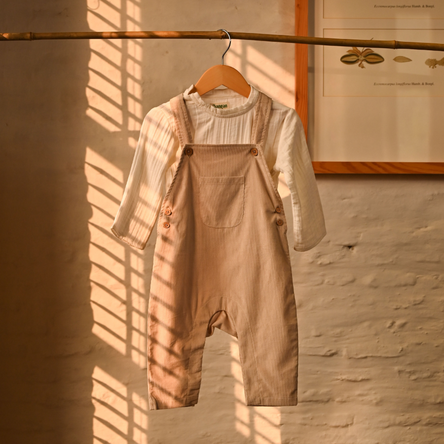 Double the charm and comfort with Aangan’s Pack of 2 Dungaree Set featuring timeless Green and Beige colors. Part of our Saundh - Nayi Kahani collection, this set is thoughtfully crafted for babies aged 0 to 24 months. Made from lightweight corduroy paired with soft organic muslin cotton tops, these dungarees offer the perfect blend of style, comfort, and freedom of movement.