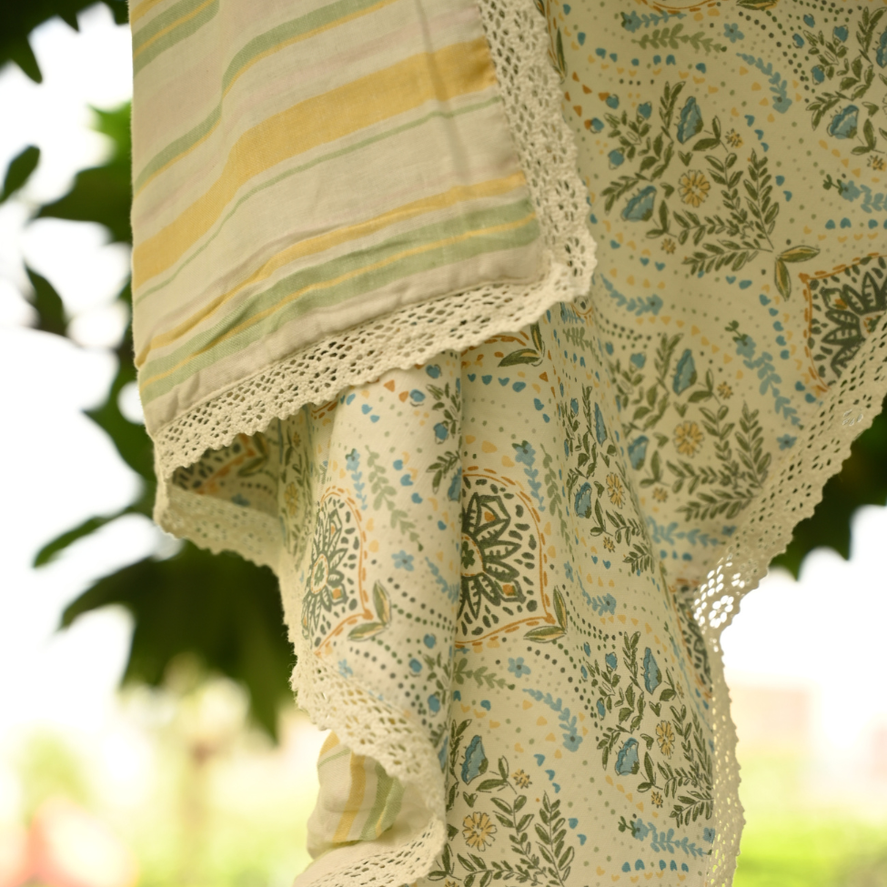 Soft as a lullaby and fresh as early morning dew, our Green Boota Print Dohar brings peace, comfort, and quiet beauty into your baby’s world. Adorned with intricate boota motifs in soothing greens and blues, and paired with a pastel striped reverse, this dohar is a gentle throwback to the grace of old-school textiles.