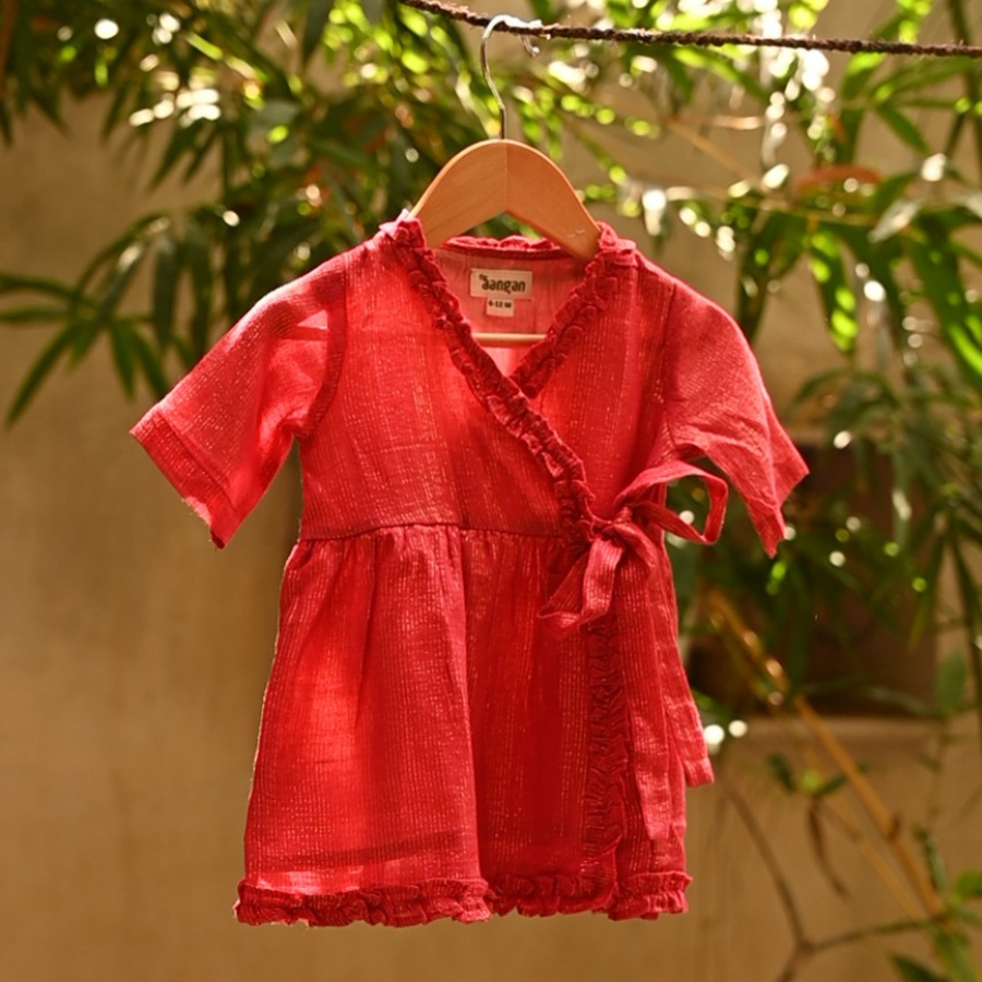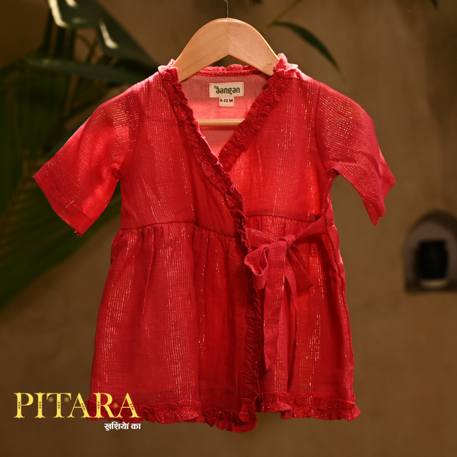 Bright as festive gulal, the Gulal Red Cotton Frock is a joyful addition to your baby’s wardrobe. Crafted in pure cotton, it’s gentle on newborn skin, non-irritating, and breathable, making it safe for all-day wear. The playful ruffle details and tie-up design bring in both comfort and festive cheer, just like dadi’s pitara of little treasures.