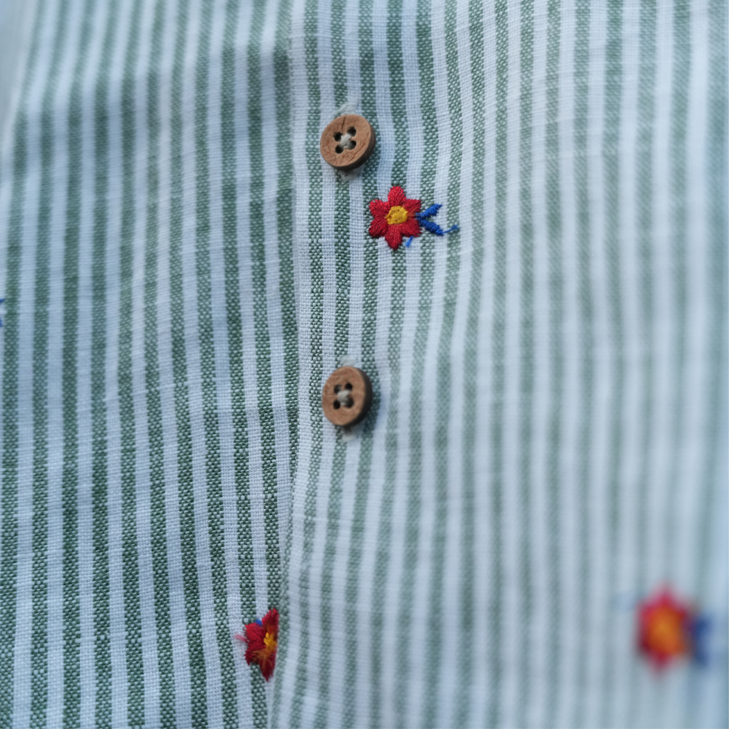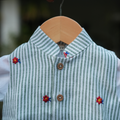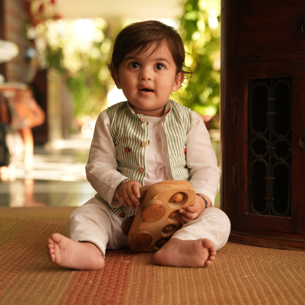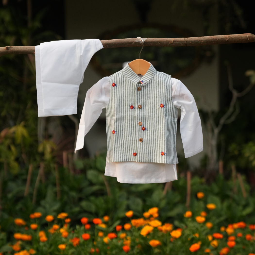 Inspired by the lush green beauty of spring, Aangan’s Harit Pushp Bandi Set brings together elegance and comfort in a delightful ensemble. The soft green Nehru jacket, embroidered with intricate floral motifs, is perfectly paired with a white kurta pajama, offering breathability, ease, and timeless grace for babies from 0 to 12 months.