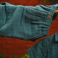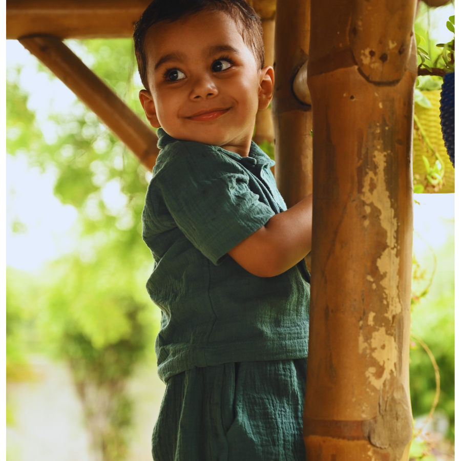 Inspired by the quiet strength of forest trails and the soft green stillness of childhood afternoons, Aangan’s Harit Van Co-ord Set brings the forest to your little one’s wardrobe. Crafted from 100% double-gauze cotton muslin, this short-sleeved shirt and matching elasticated shorts offer breathability, ease, and all-day play comfort.