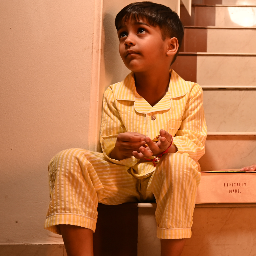 Laalten Raatein features a cheerful yellow-and-white vertical stripe pattern that feels like a ray of moonlight on sleepy cheeks. Thoughtfully tailored in 100% pure cotton, this night suit promises breathable comfort through every twist and turn of your little dreamer’s night.