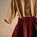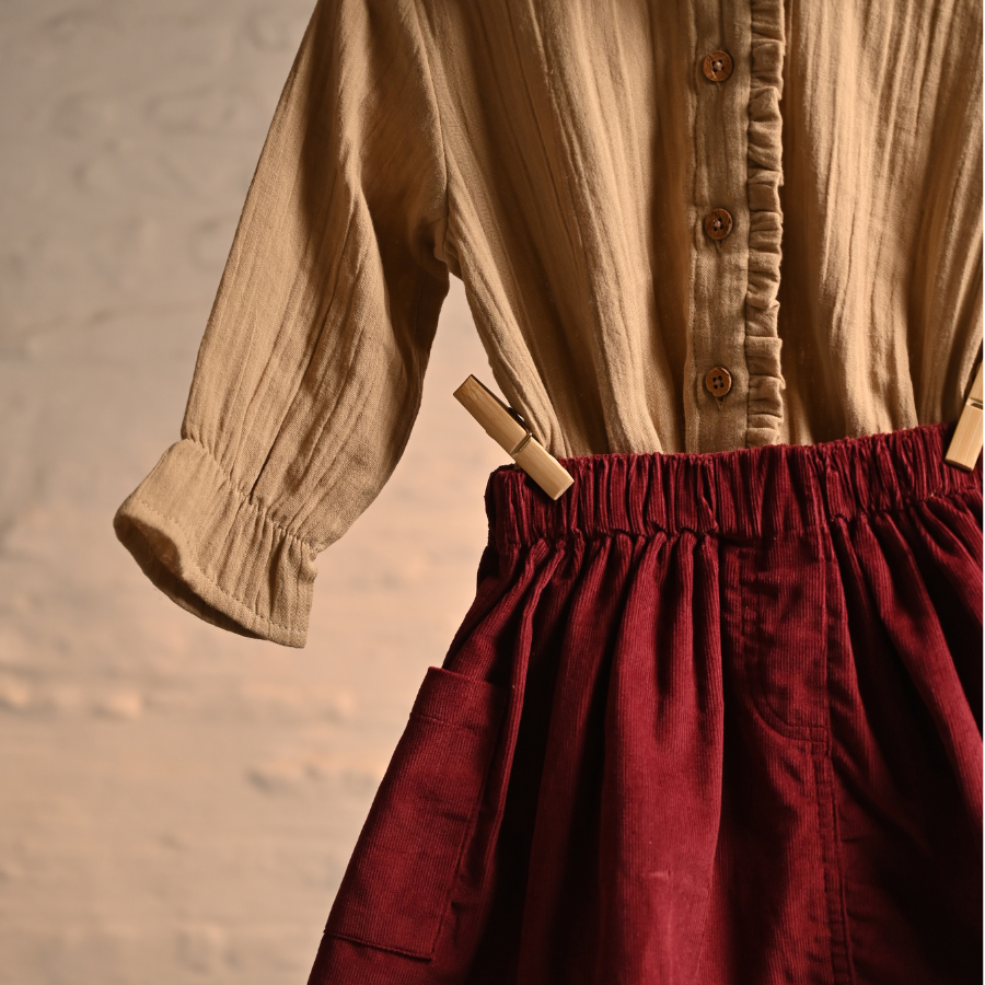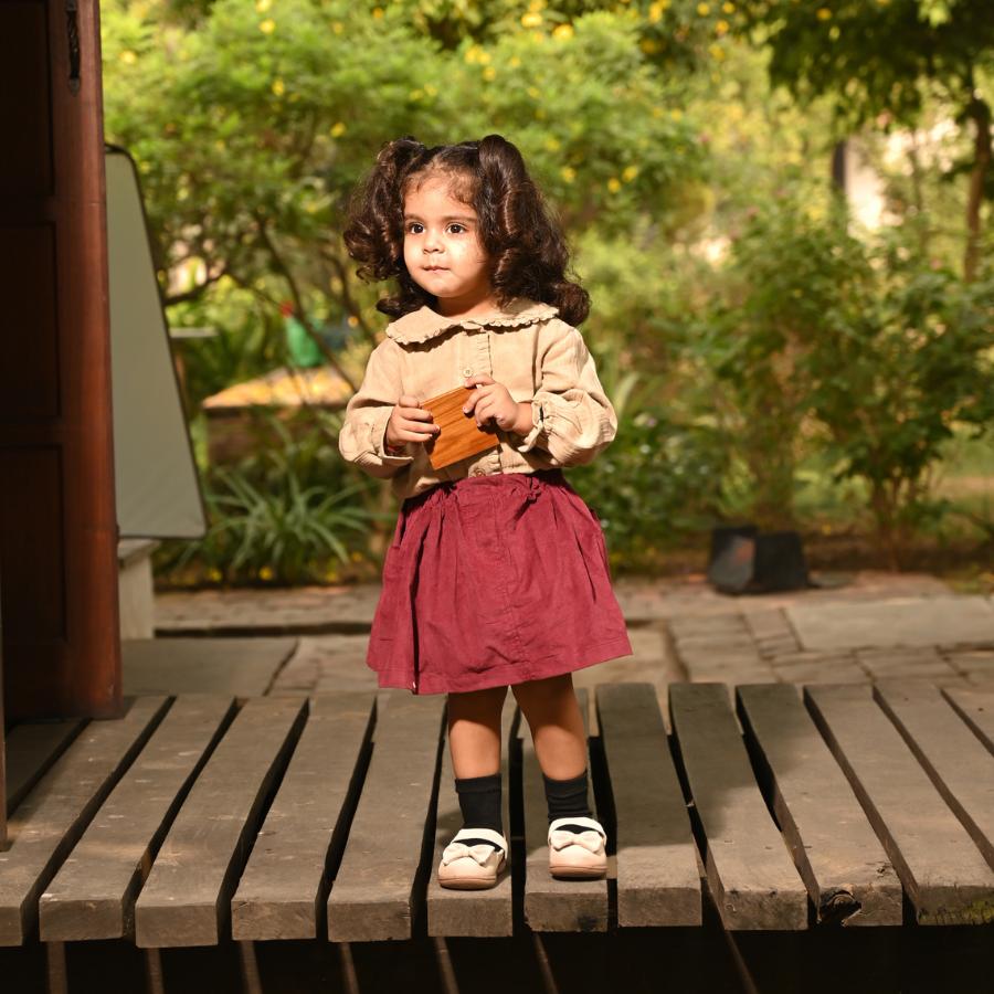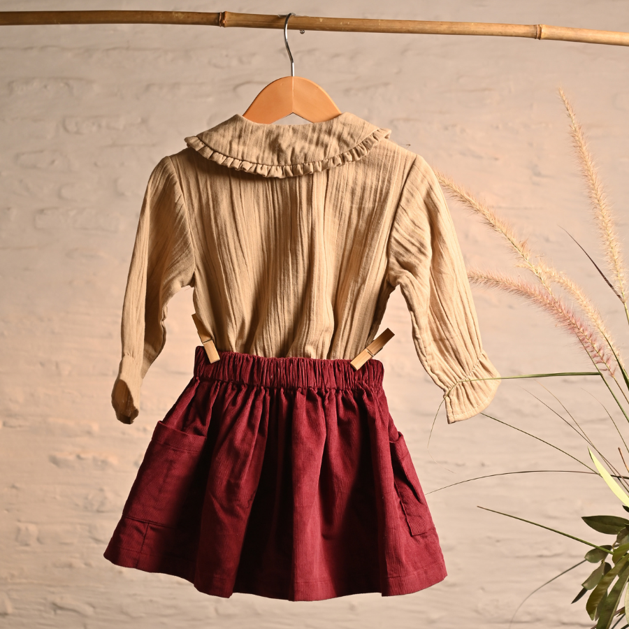 Add a touch of elegance to your child’s wardrobe with Aangan’s Maroon Corduroy Skirt Set, featuring a soft khaki muslin top. This set, part of our Saundh - Nayi Kahani collection, is thoughtfully crafted to keep your little one comfortable while embracing the charm of traditional designs. The lightweight corduroy skirt and organic muslin top are perfect for mild winter days, offering both style and comfort.