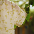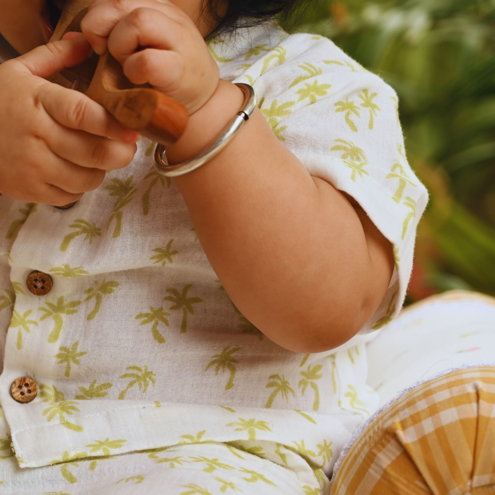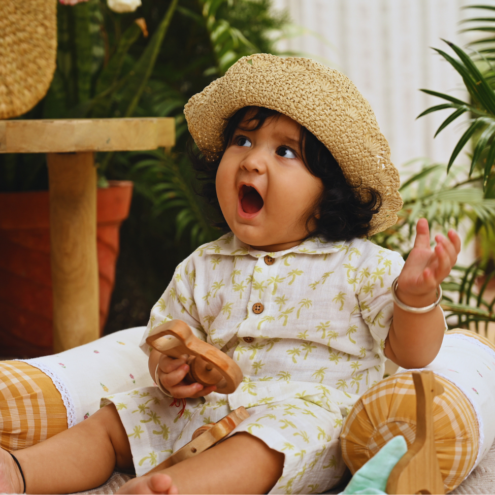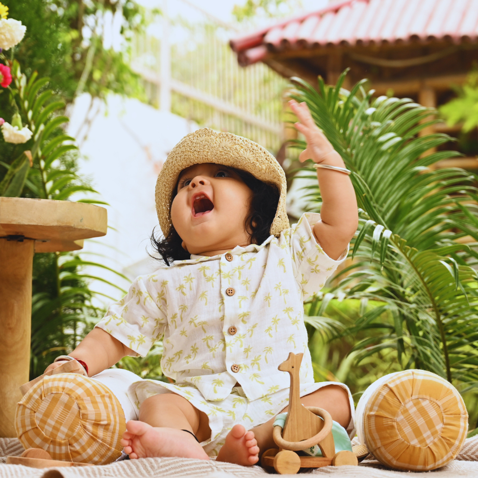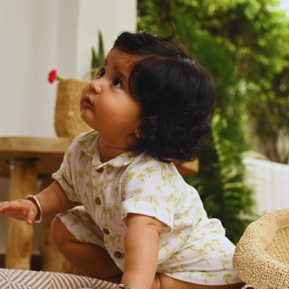Aangan’s Naariyal Co-ord Set brings the breezy charm of coastal summers to your little one’s everyday wardrobe. With its playful coconut tree print on a soft, off-white base, this set feels like a vacation in fabric form. Made from 100% double-gauze cotton muslin, it includes a relaxed button-down shirt and elasticated shorts—perfect for playtime, beach strolls, or lazy afternoon naps in the aangan.