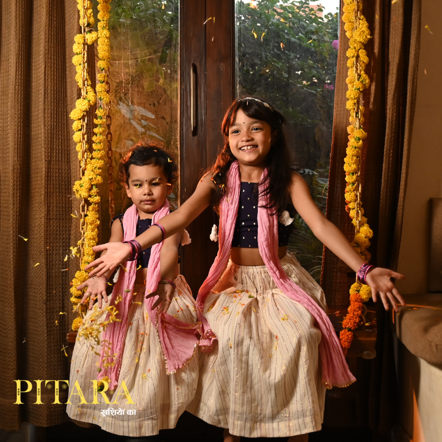 Reminiscent of childhood twirls in nani’s courtyard, the Neelam Stripes Lehenga Set is designed in 100% natural cotton for ultimate comfort and play. It features a striped lehenga with soft gathers, a navy blue tie-up blouse adorned with tassels, and a pink dupatta to complete the festive look. Baby-safe and itch-free, it’s perfect for your little one’s first Diwali as well as wedding celebrations through the growing years.