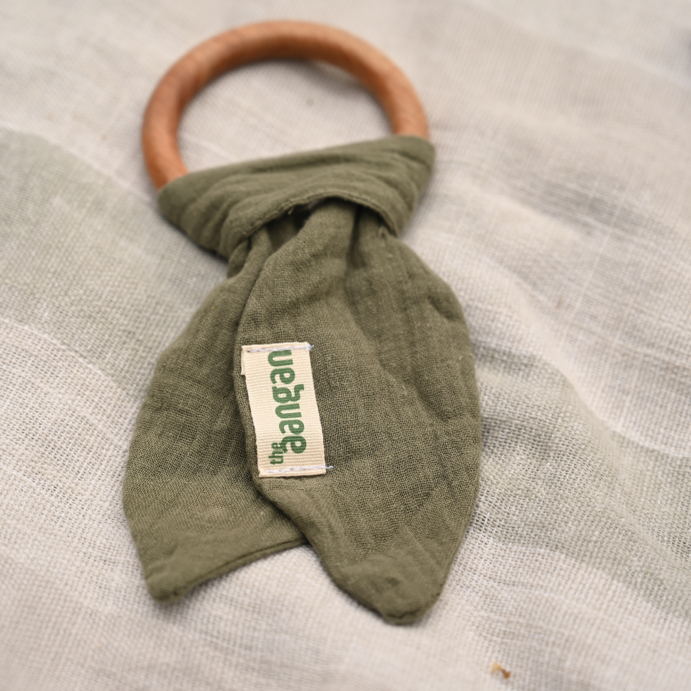Neem Wood Baby Toy – Natural Teether with Cotton Bow (Olive)