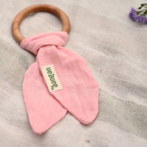 Neem Wood Baby Toy – Natural Teether with Cotton Bow (Pink)