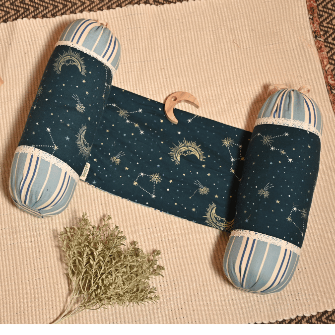 Ensure your baby sleeps safely and comfortably with the Organic Cotton Anti-Roll Side Pillow in Green & Gold Moon & Star Print from Aangan. Thoughtfully designed for babies aged 0 to 12 months, this anti-roll side pillow offers essential support to keep your little one securely in place while they sleep, giving parents peace of mind.