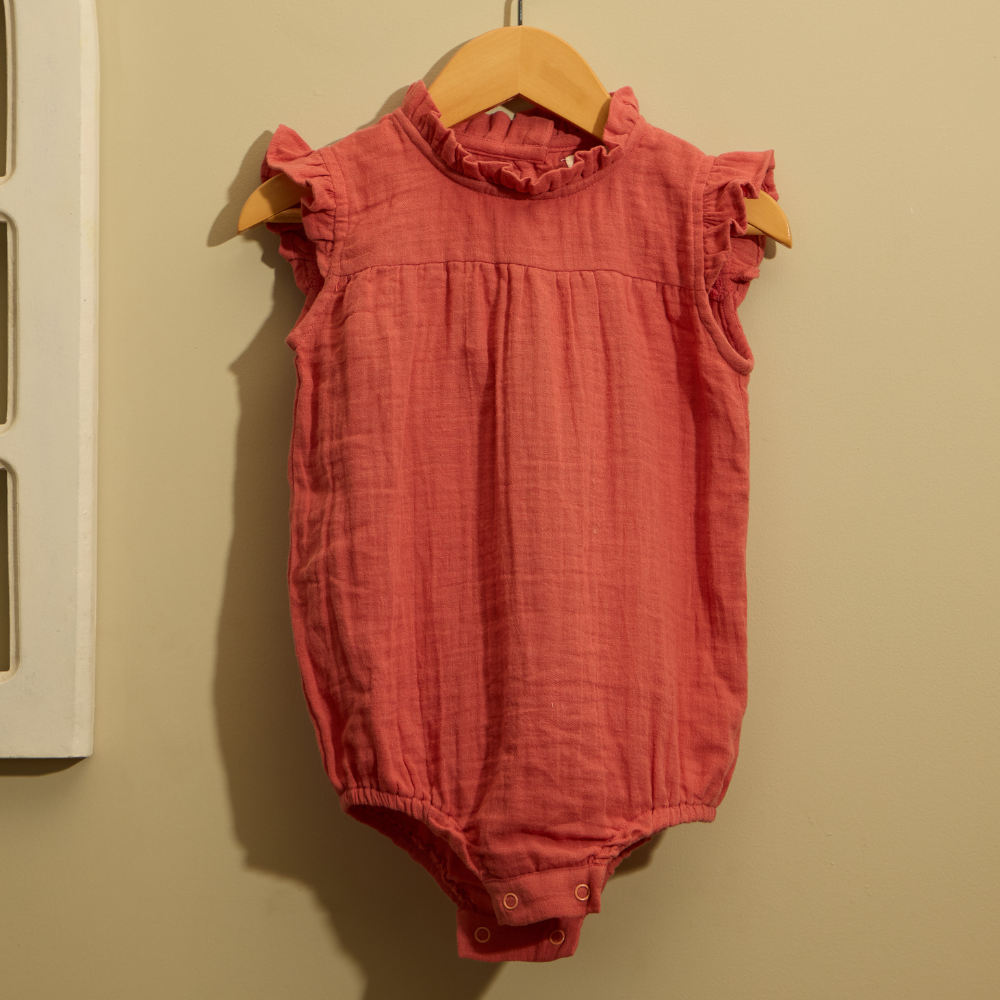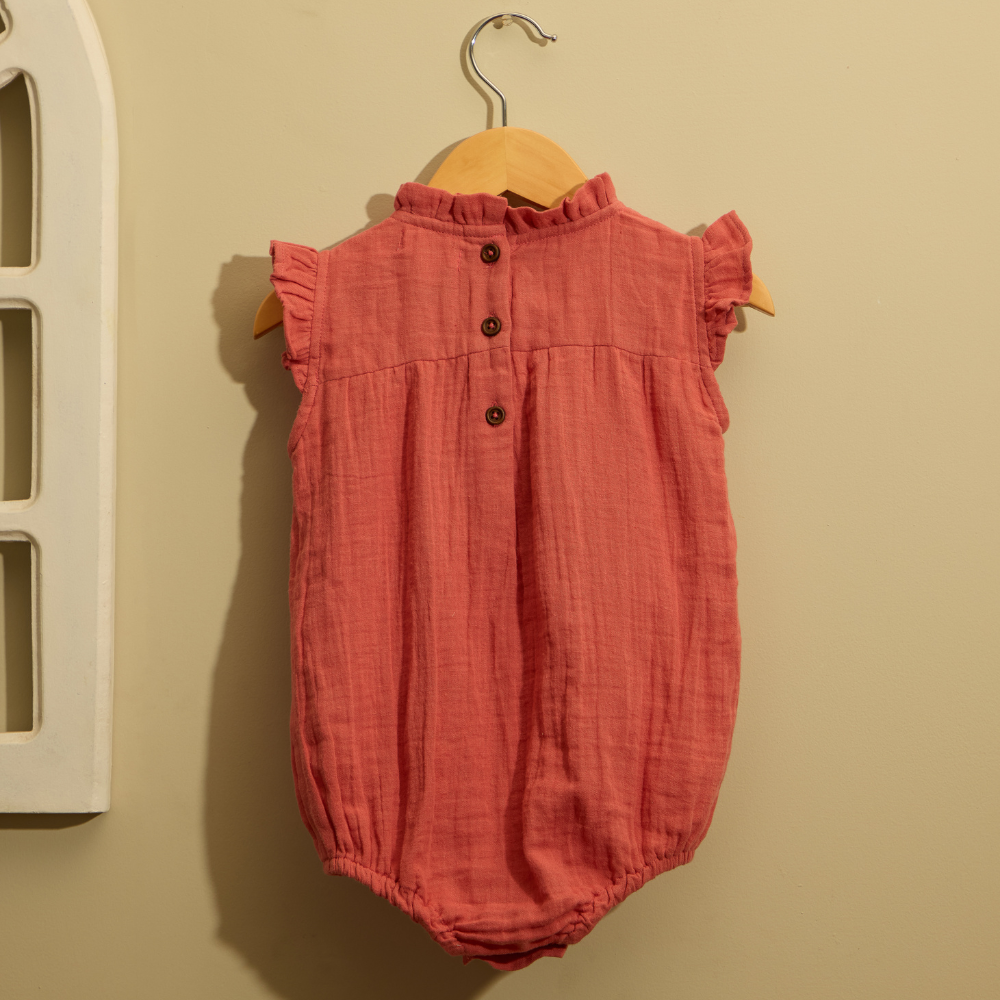 Elevate your baby girl's wardrobe with the Peach Blossom Organic Muslin Romper from Aangan – where comfort meets style, naturally.