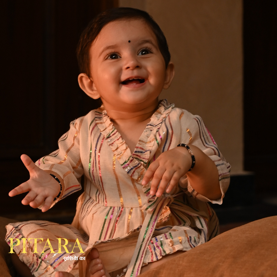 Inspired by dadi-nani’s hand-stitched charm, the Striped Cotton Wrap Frock is designed for your little one’s first festive moments. Made in 100% natural cotton, this frock is baby-safe, breathable, and itch-free, ensuring only comfort for delicate skin. With its wrap design and soft pastel stripes, it’s perfect for pujas, family gatherings, and everyday cuddles.