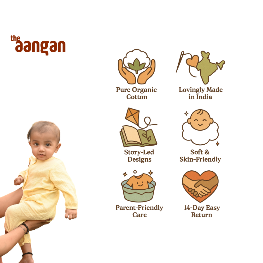 At Aangan, we’re more than just a brand; we’re a celebration of childhood and Indian traditions. Join us in creating lifelong memories and joyful adventures for your little ones.