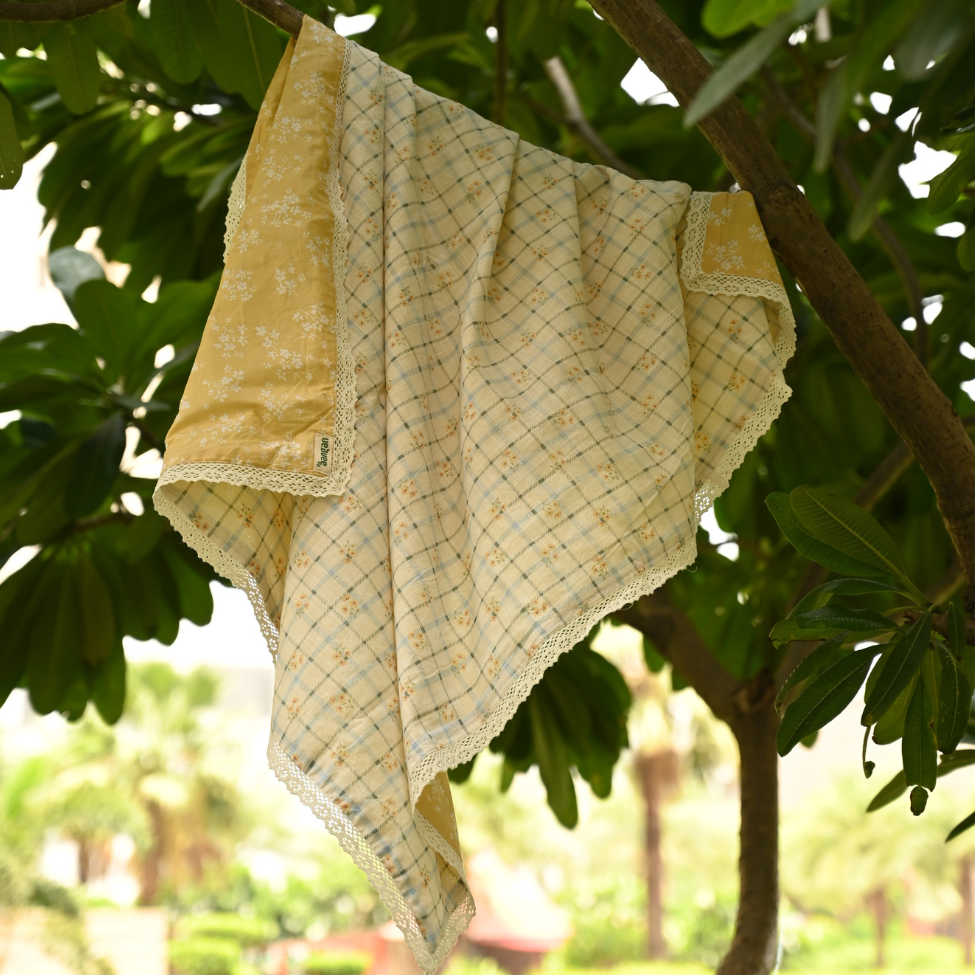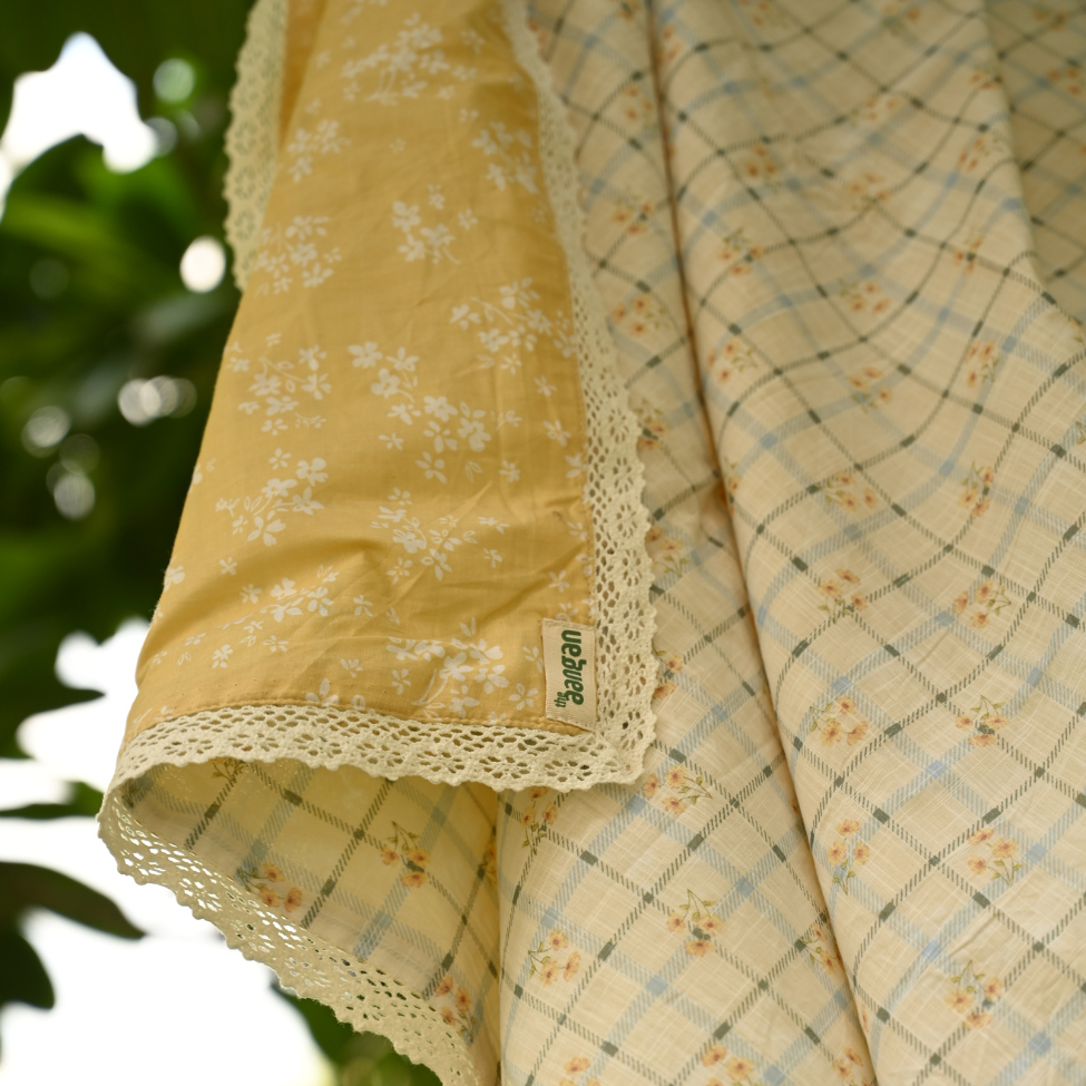 Featuring a gentle checkered pattern with dainty florals on one side and a mustard blossom print on the reverse, this dohar is thoughtfully finished with a delicate lace trim. Made from 100% organic muslin cotton, it’s lightweight, breathable, and baby-safe—perfect for every nap, cuddle, and cosy moment.